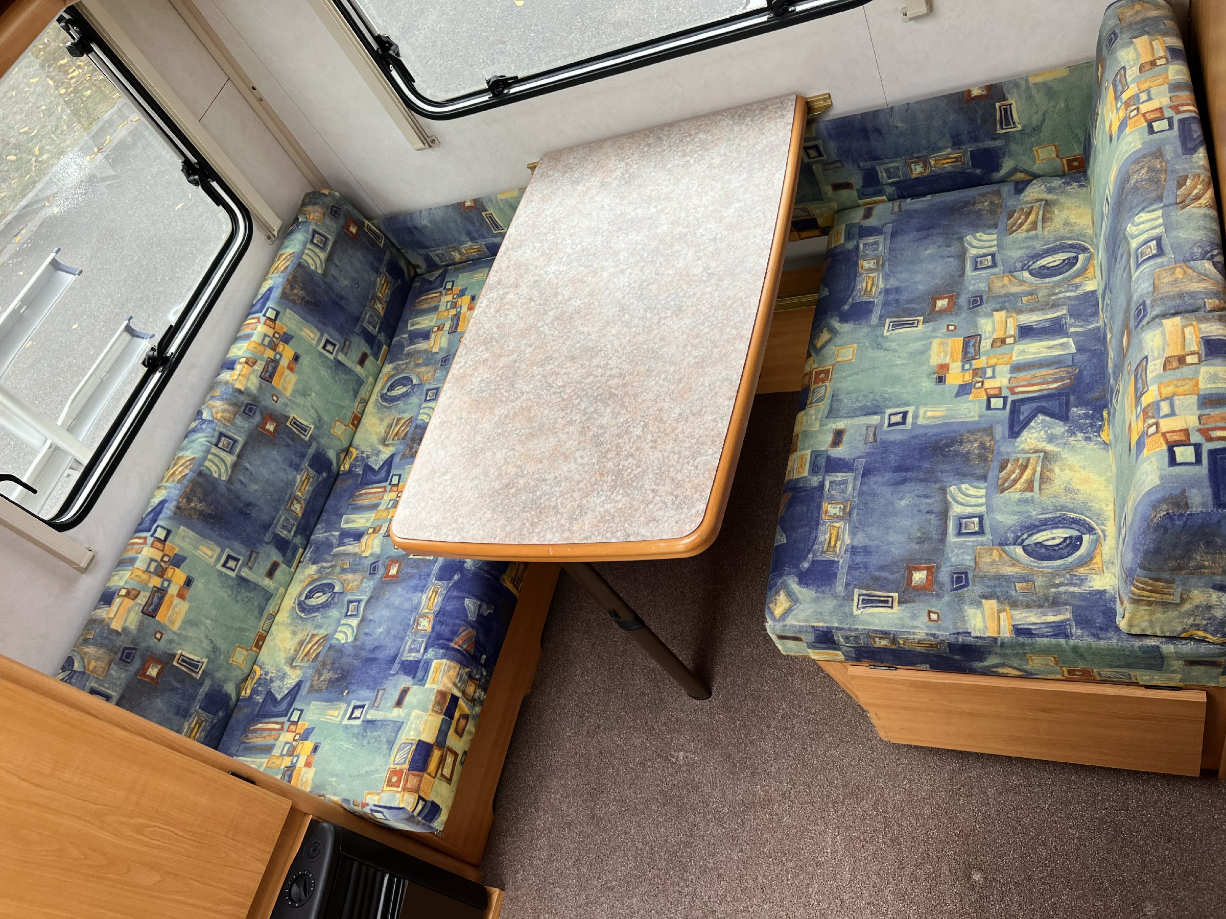 - Karavan pro čtyři osoby v rozložení postele po stranách oddělené uličkou a na zadní straně sezení na levém boku je rozkládací na spaní.