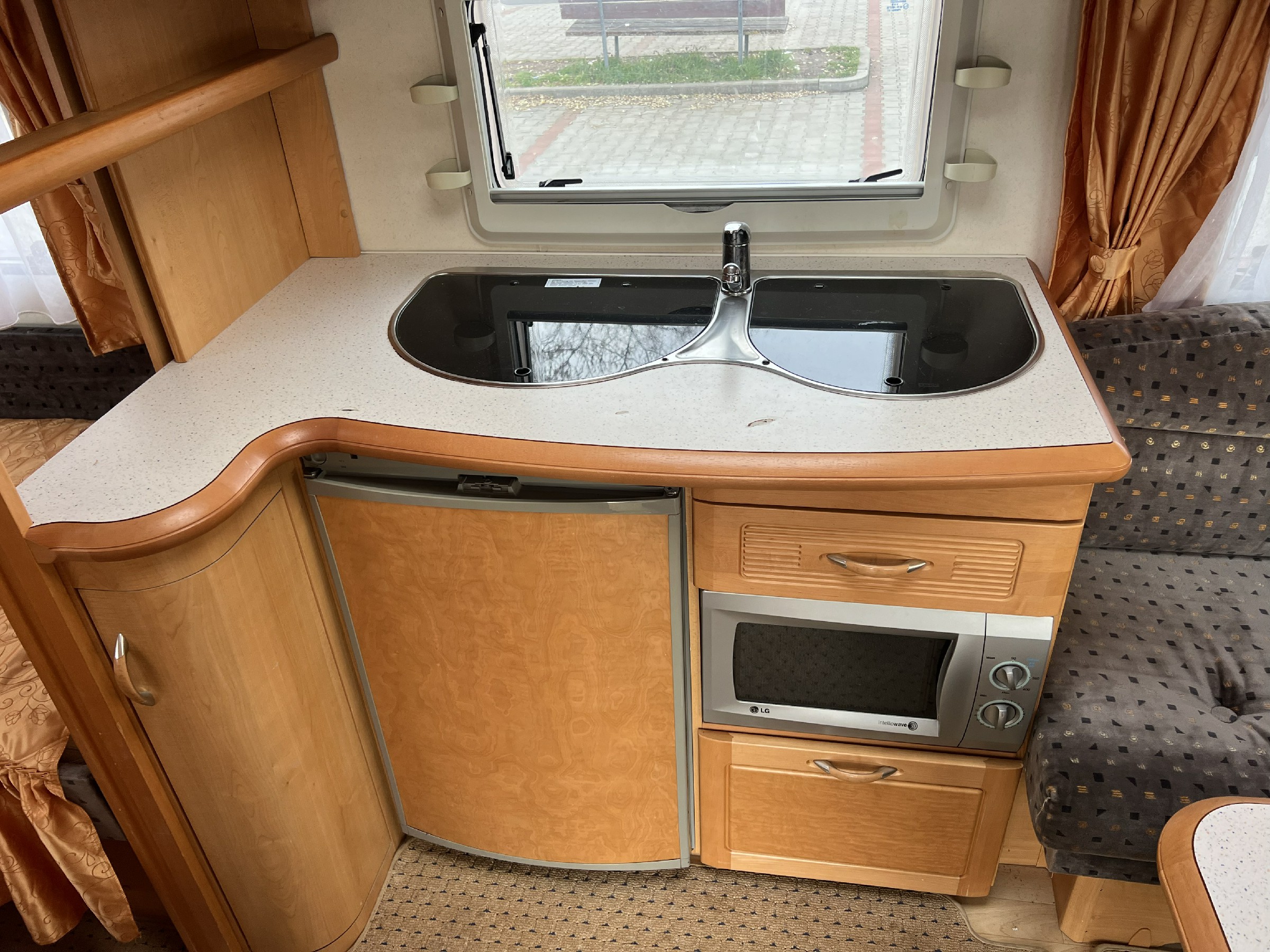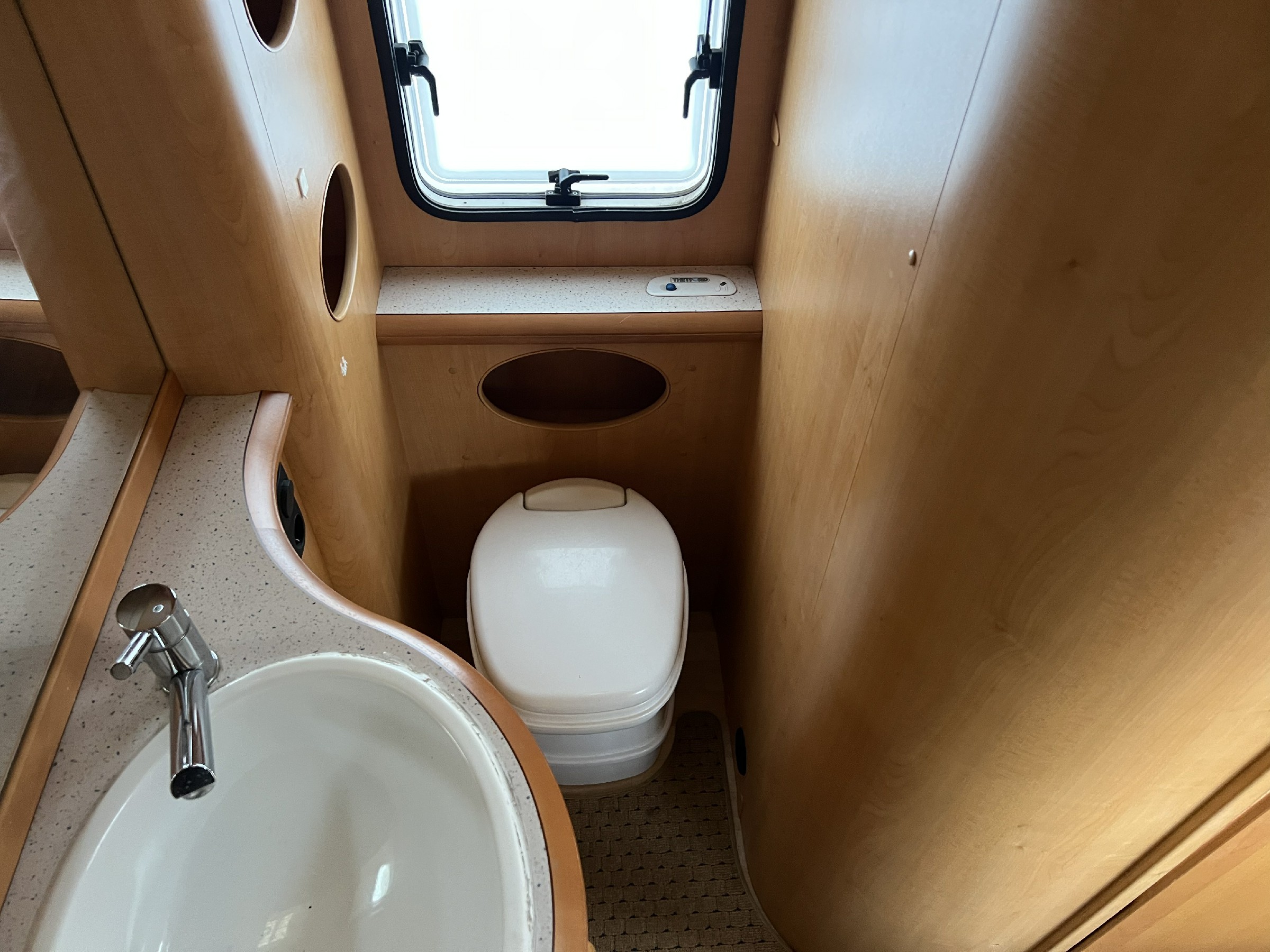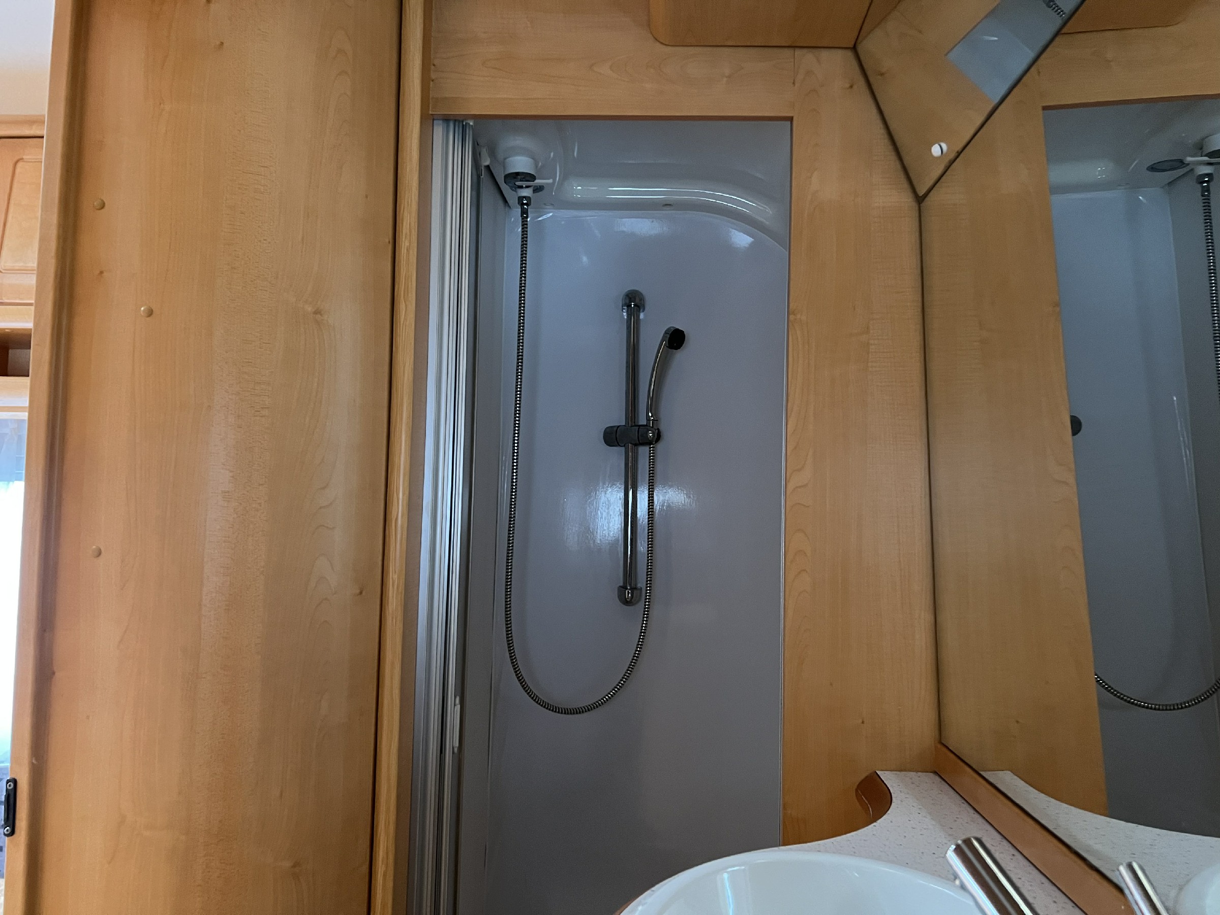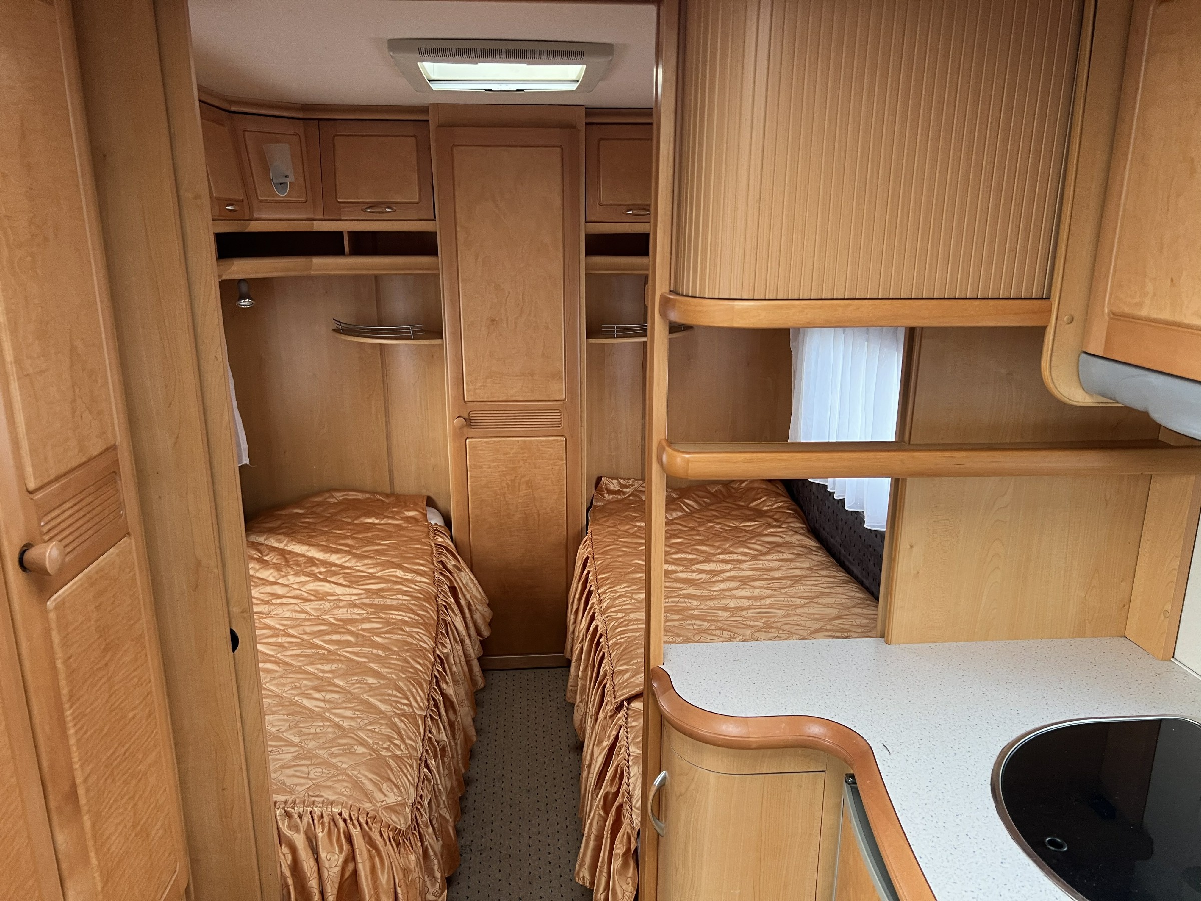 - Karavan pro 4 osoby se samostatnou sprchou a WC. Rok výroby 2006 v rozložení dvě pevné postele oddělené uličkou, velké sezení do U na přední straně a samostatná koupelna a WC na zádi. Vybaven plynovým topením Trumatic s rozfukem, mikrovlná trouba, lednice v trojkombinaci Dometic, tříplotýnkový sporák, dřez, el. bojler na teplou vodu, velká nádrž na vodu pod postelí. Samostatná toalteta Thetford na pravé straně a prostorná sprcha na levé straně, sítě proti hmyzu a termorolety, šatní skříň, Hekki okno. Trakční baterie, anténa, led osvětlení, markýza Fiamma, automatický pojezd na dálkové ovládání Enduro. Nájezdová brzda a stabilizátor Winterhof, 13 PIN zásuvka. Uvnitř podlahové koberce pro vyšší komfort v zimním období.
